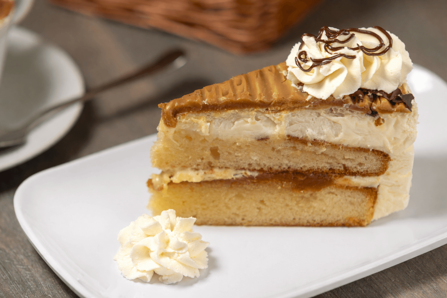 This cake pairs soft vanilla sponge with generous swirls of dulce de leche-style salted caramel for a warm, rounded sweetness. Dark chocolate curls bring a deeper cocoa edge and a refined finish. The result is creamy, comforting, and layered in flavor—ideal for those who love caramel desserts with a touch of intensity.