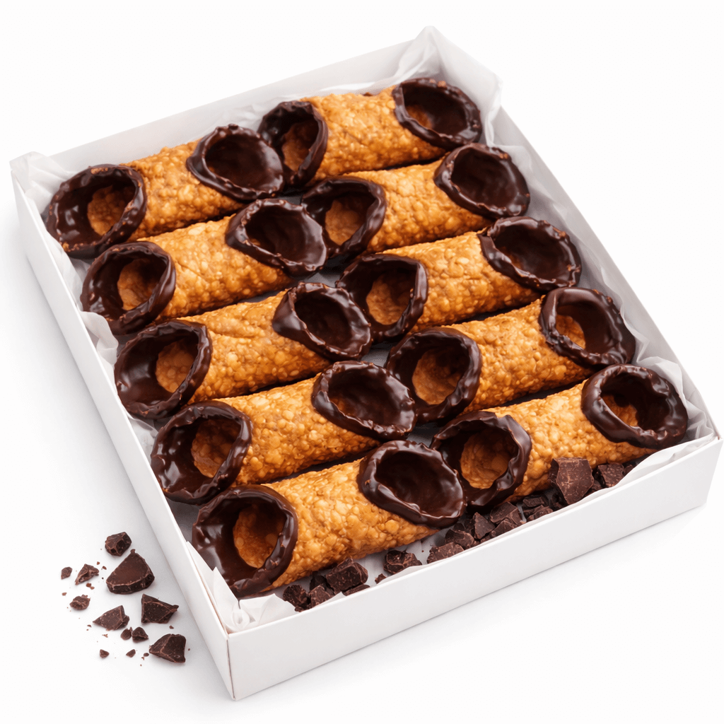 Our Large Chocolate Cannoli shells are fried until golden and bubbly for that signature crunch, then finished with a glossy chocolate coating on each end. They’re delivered empty, ready to be filled at service with ricotta cream, pastry cream, or any specialty filling—ideal for keeping the shell crisp until the moment you serve. (Available packs: 12 pcs / 48 pcs.)